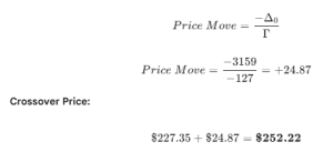 Summary: Your delta will crossover to negative at approximately $252.22. You have a roughly $25 cushion (11%) before your current bullish stance flips to a bearish lean.